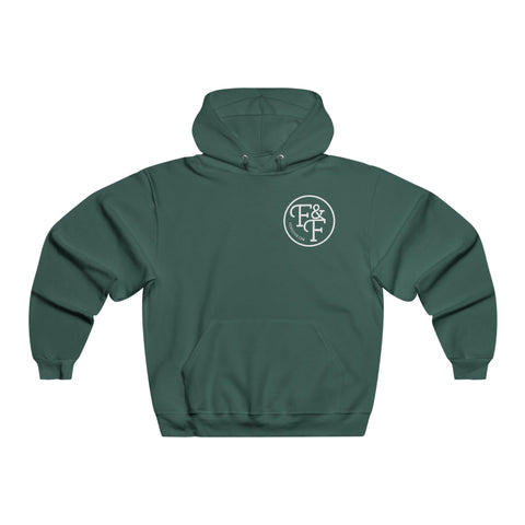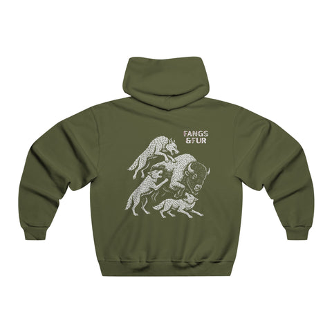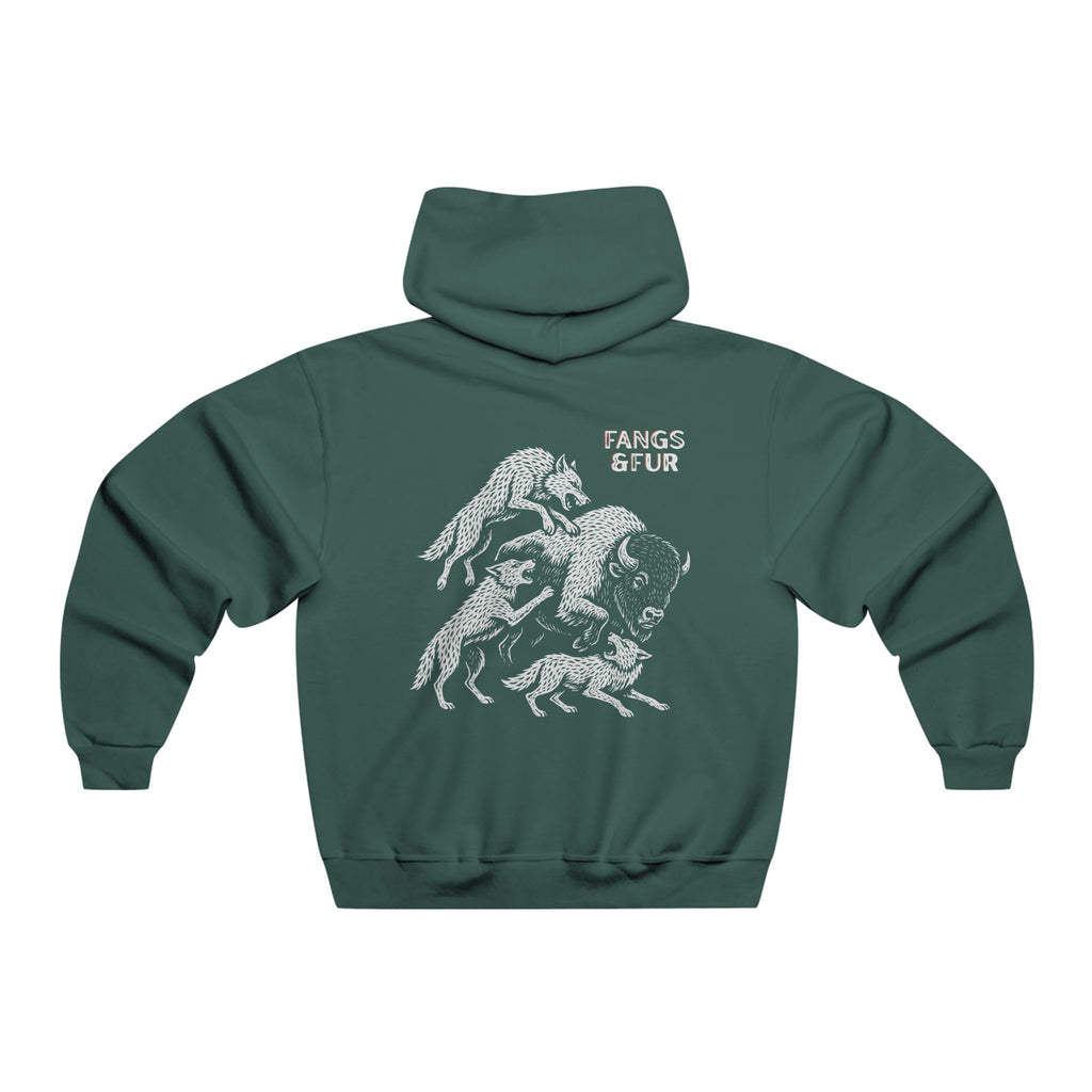 This olive-green hooded sweatshirt brings quiet strength and a touch of wilderness to your everyday rotation. The front carries a small, circular emblem for low-key branding, while the back unfolds into a detailed, hand-etched scene of wolves and a bison with the “Fangs & Fur” mark — a design that reads like a favorite story told around a campfire. The medium-heavy knit feels substantial but soft, draping in a loose, comfortable silhouette. A roomy kangaroo pocket and adjustable hood add practical warmth for early mornings on the trail or slow, late-night drives. Built to last, the blended fibers hold print detail beautifully and the seamless body keeps the look clean. Wear it when you want to feel grounded, rugged, and quietly bold.